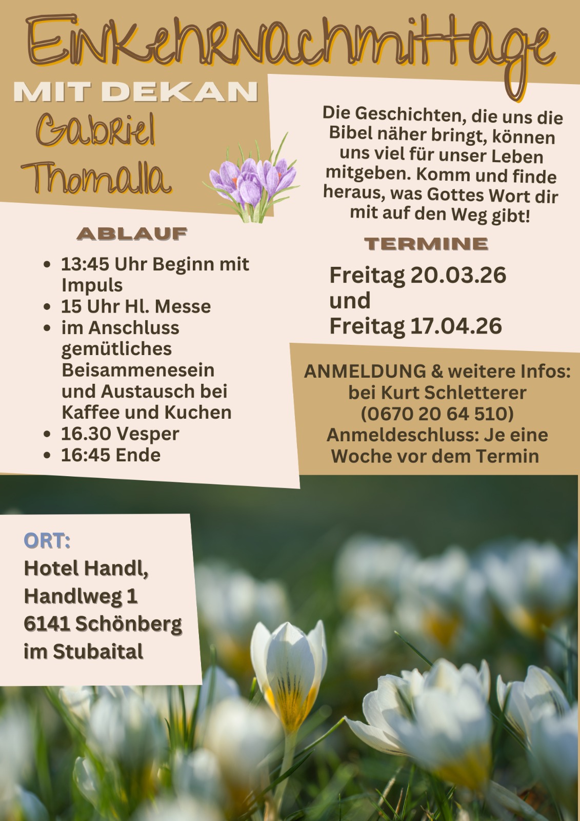 Im März und April 2026 veranstaltet Dekan Gabriel wieder zwei Einkehrnachmittage im Gasthof Handl in Schönberg im Stubaital. Alle Interessierten sind herzlich dazu eingeladen.